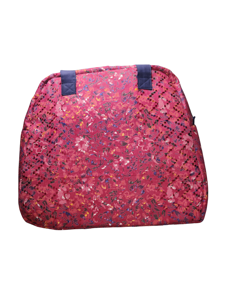 This hand embroidered bag is more than a tote—it is a celebration of Indian craftsmanship translated into a modern, functional accessory. Carefully stitched by skilled artisans, the bag features delicate floral embroidery on a contrasting solid panel, paired with a rich printed cotton body that adds depth and character.