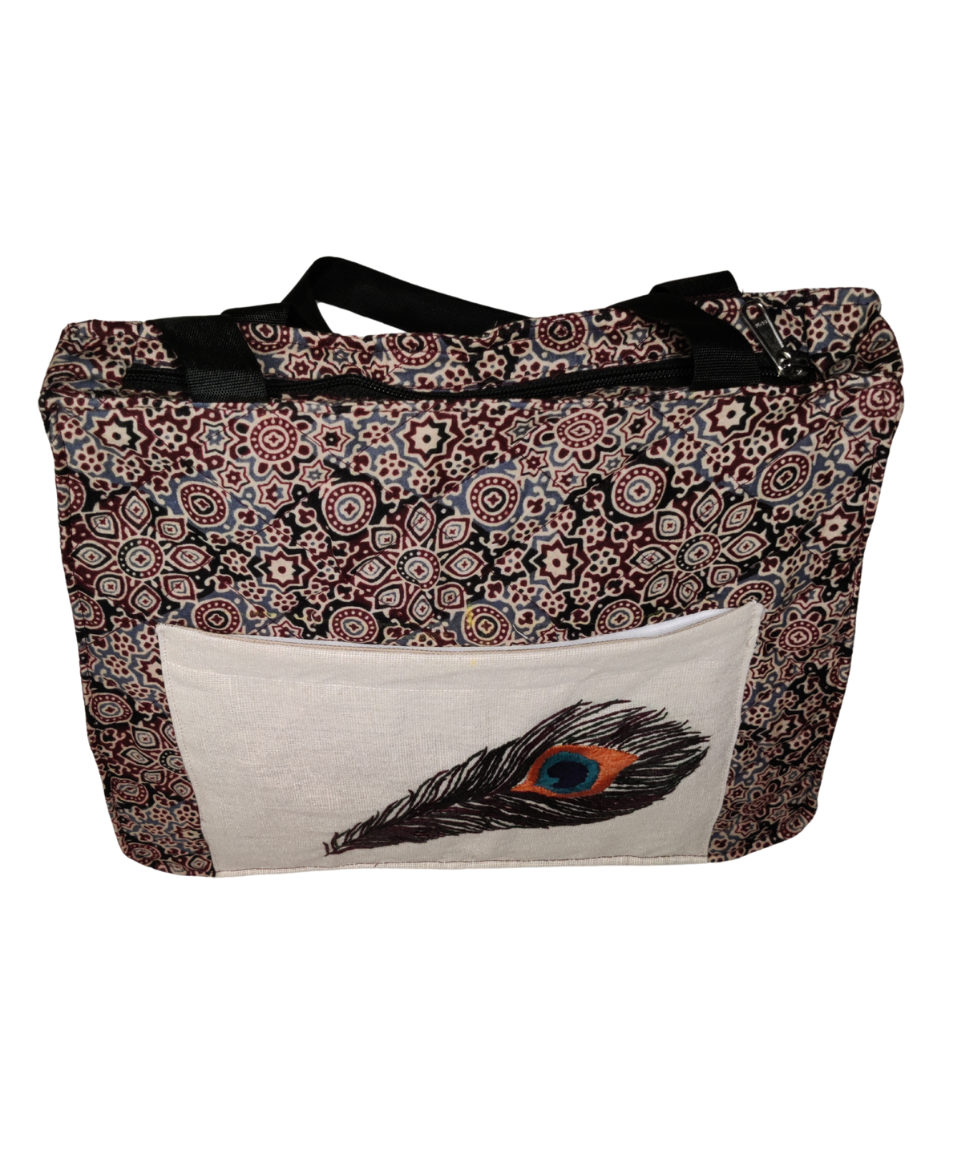 This hand embroidered tote bag is a celebration of slow fashion and artisan skill. The outer fabric features a rich cotton print, accented with a delicately hand-embroidered motif on the front pocket. Each stitch reflects the patience and artistry of Indian craftspeople, making every bag subtly unique.
