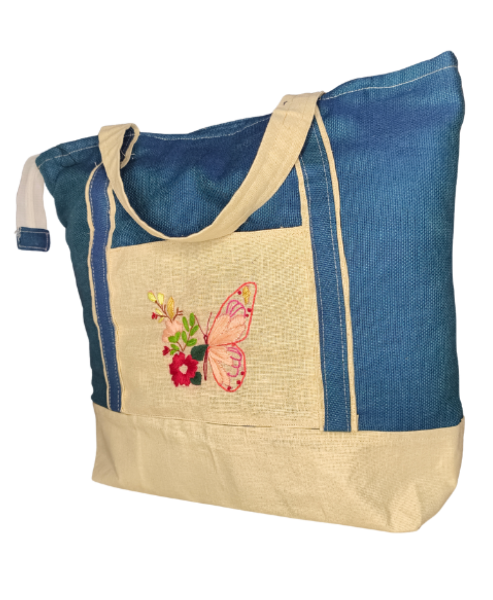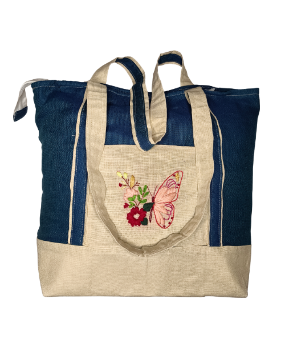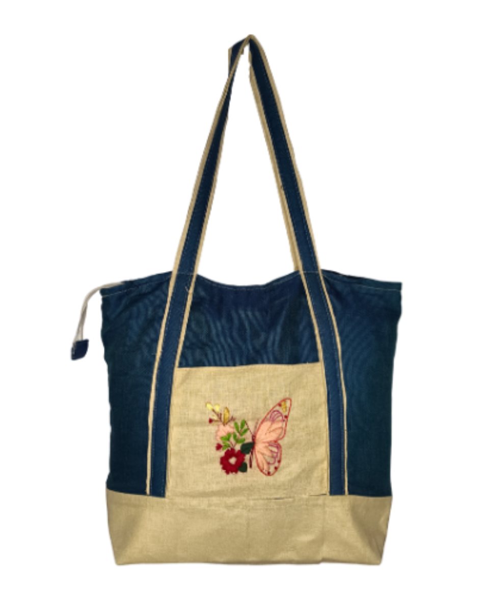 This hand embroidered tote bag reflects the refined simplicity of Indian craftsmanship blended with practical modern design. The front panel features delicate butterfly and floral embroidery, stitched carefully by skilled artisans. Every thread tells a story of patience and precision.