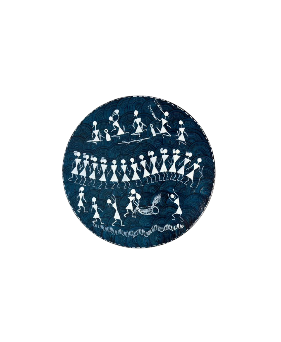 Rooted in the timeless traditions of Warli tribal art, this handcrafted wooden hot plate narrates the rhythm of rural life where community, nature, and celebration move as one. The circular Warli painting depicts tribal dancers and everyday village scenes, symbolizing unity, prosperity, and the sacred bond between humans and nature. Every brushstroke carries the wisdom of generations, making this piece not just functional, but deeply cultural.