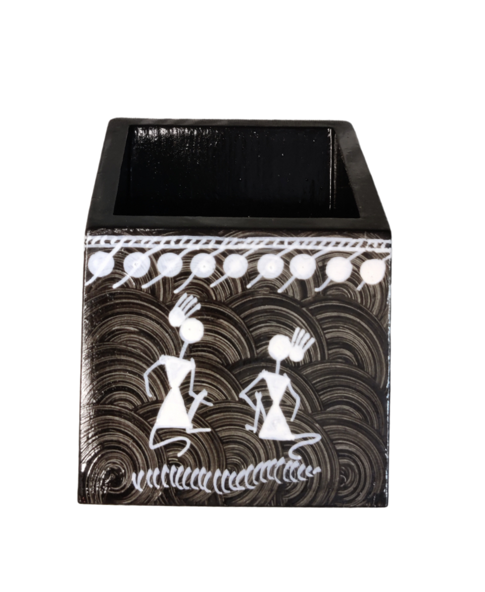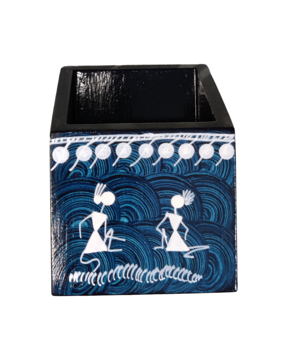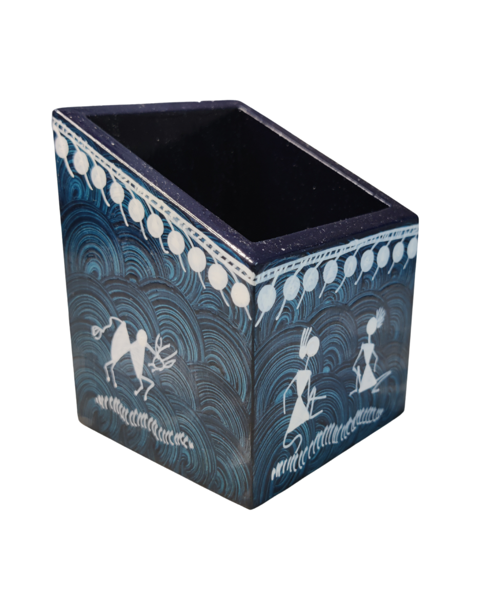 Handcrafted wooden pen stand featuring authentic Warli painting. Eco-friendly tribal art décor, perfect for office desks and thoughtful gifting. Compact size: 3 × 3 × 4 inches.
