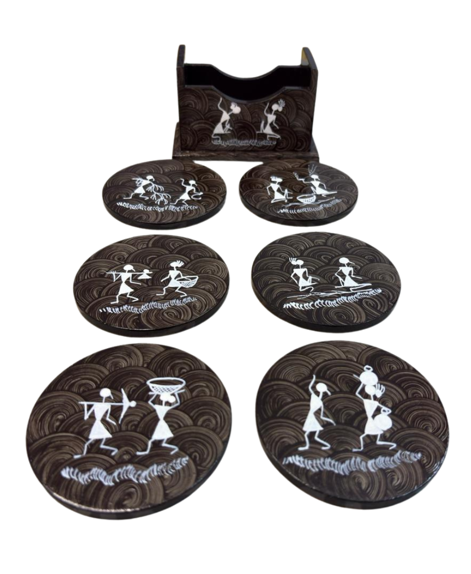Handmade Warli art round coaster set with stand, crafted using Card Bord and hand-painted with acrylic colours. A perfect blend of Indian folk art, utility, and sustainable décor.