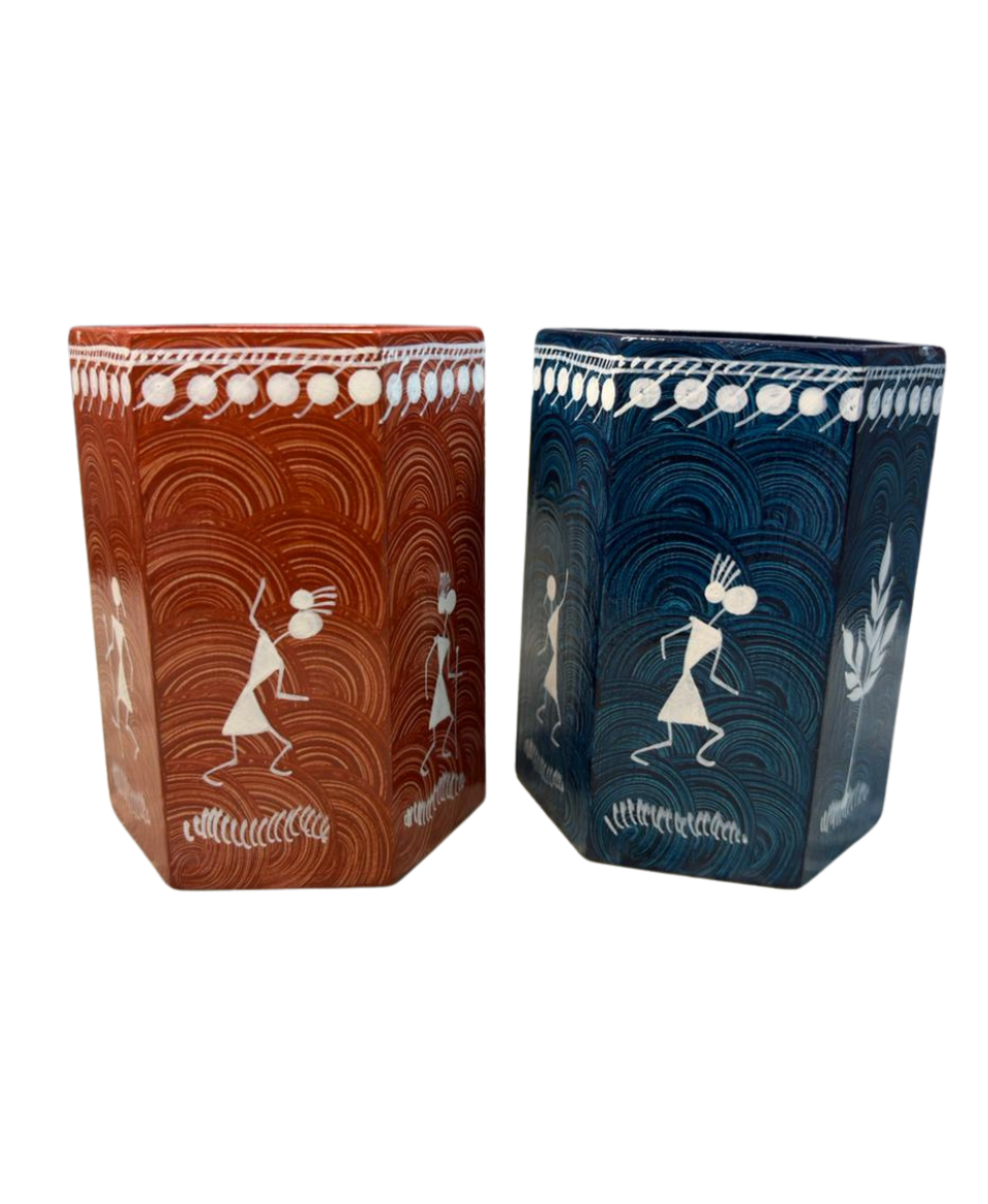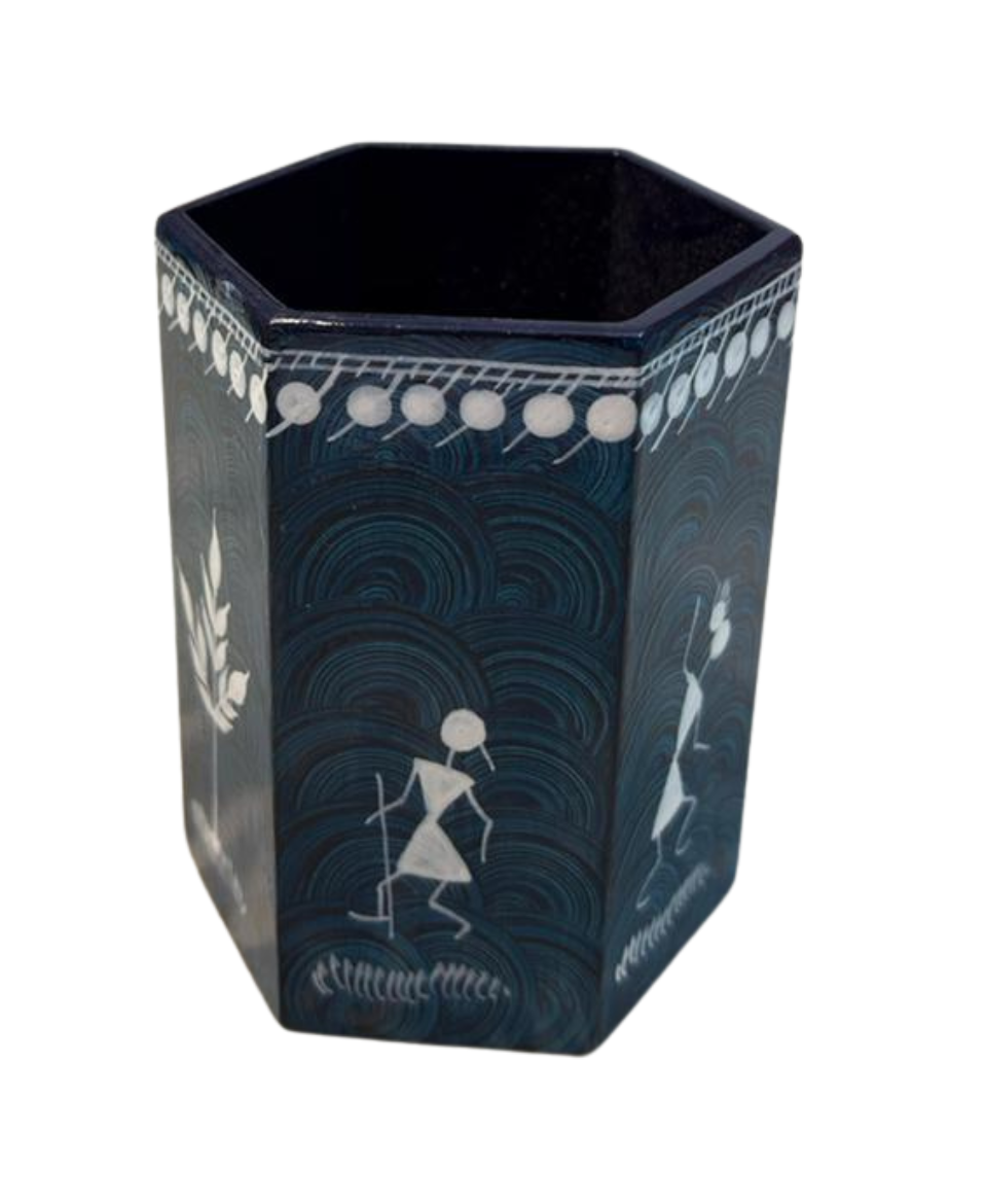 This pen stand is handmade and hand-painted by skilled artisans using sustainably sourced wood. Natural earthy pigments—traditionally inspired by rice paste and clay tones—are applied meticulously to create classic Tribal Warli Painting motifs. The hexagonal form not only enhances visual appeal but also ensures stability and durability for daily use.