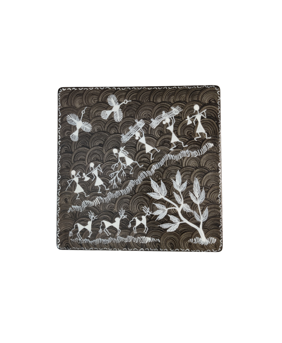 Handcrafted Warli Painting Wooden Hot Plate (8×8 inches). Eco-friendly Indian folk art décor, hand-painted by tribal artisans.