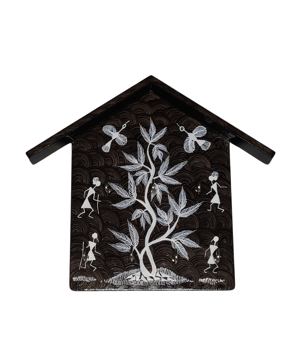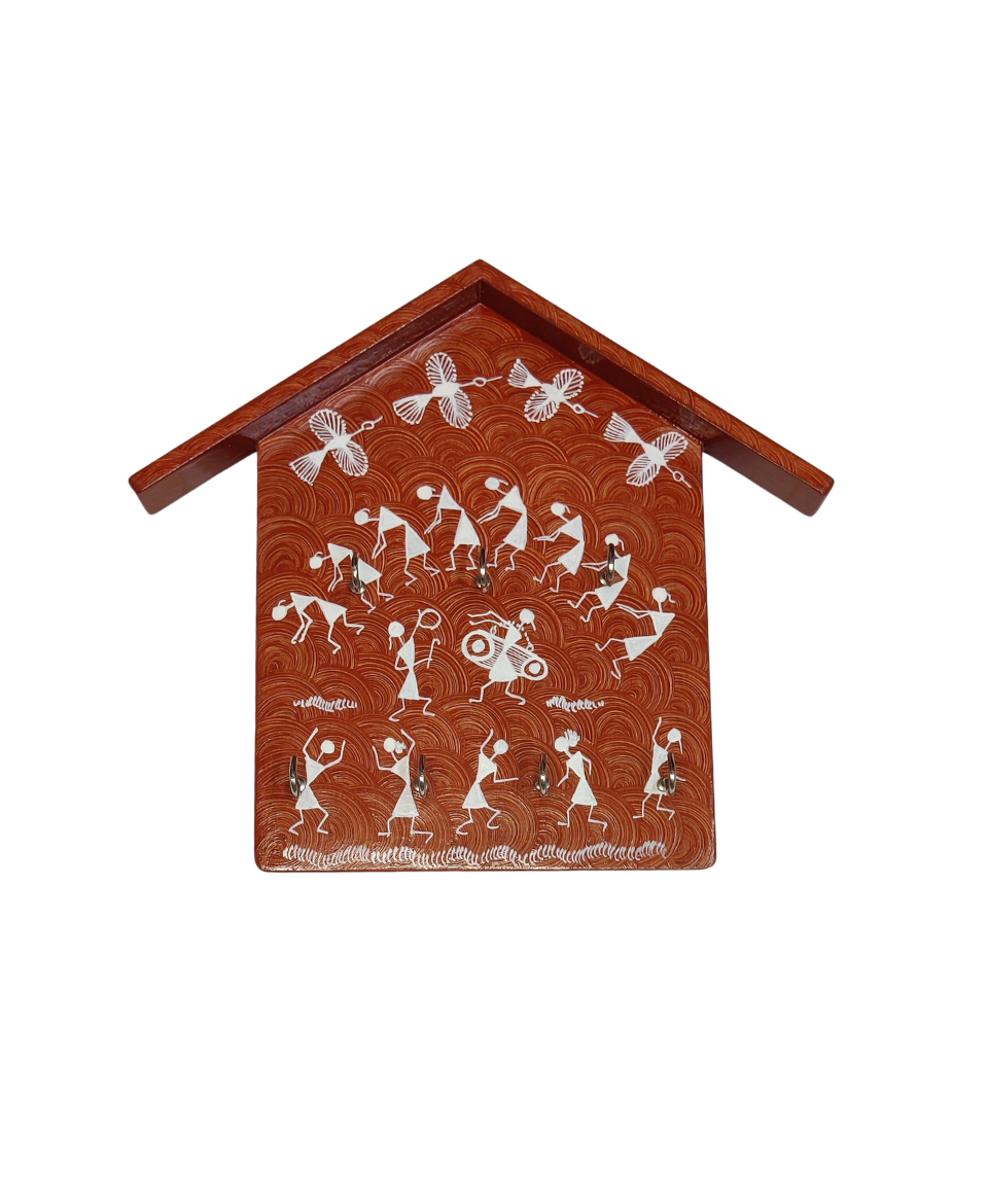 Rooted in the timeless traditions of Maharashtra’s Warli tribes, this handcrafted wooden key holder brings an authentic slice of Indian folk culture into your everyday living. The rhythmic dance forms, musical celebration, and nature-inspired motifs painted in classic Warli style narrate stories of community, harmony, and joy—turning a functional wall accessory into a living piece of art.